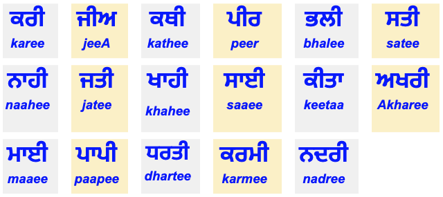 ਈਂ ਸੀਂ ਹੀਂ। ਕੀਂ ਖੀਂ ਗੀਂ ਘੀਂ ਙੀਂ। ਚੀਂ ਛੀਂ ਜੀਂ ਝੀਂ ਞੀਂ। ਟੀਂ ਠੀਂ ਡੀਂ ਢੀਂ ਣੀਂ। ਤੀਂ ਥੀਂ ਦੀਂ ਧੀਂ ਨੀਂ। ਪੀਂ ਫੀਂ ਬੀਂ ਭੀਂ ਮੀਂ। ਯੀਂ ਰੀਂ ਲੀਂ ਵੀਂ ੜੀਂ।